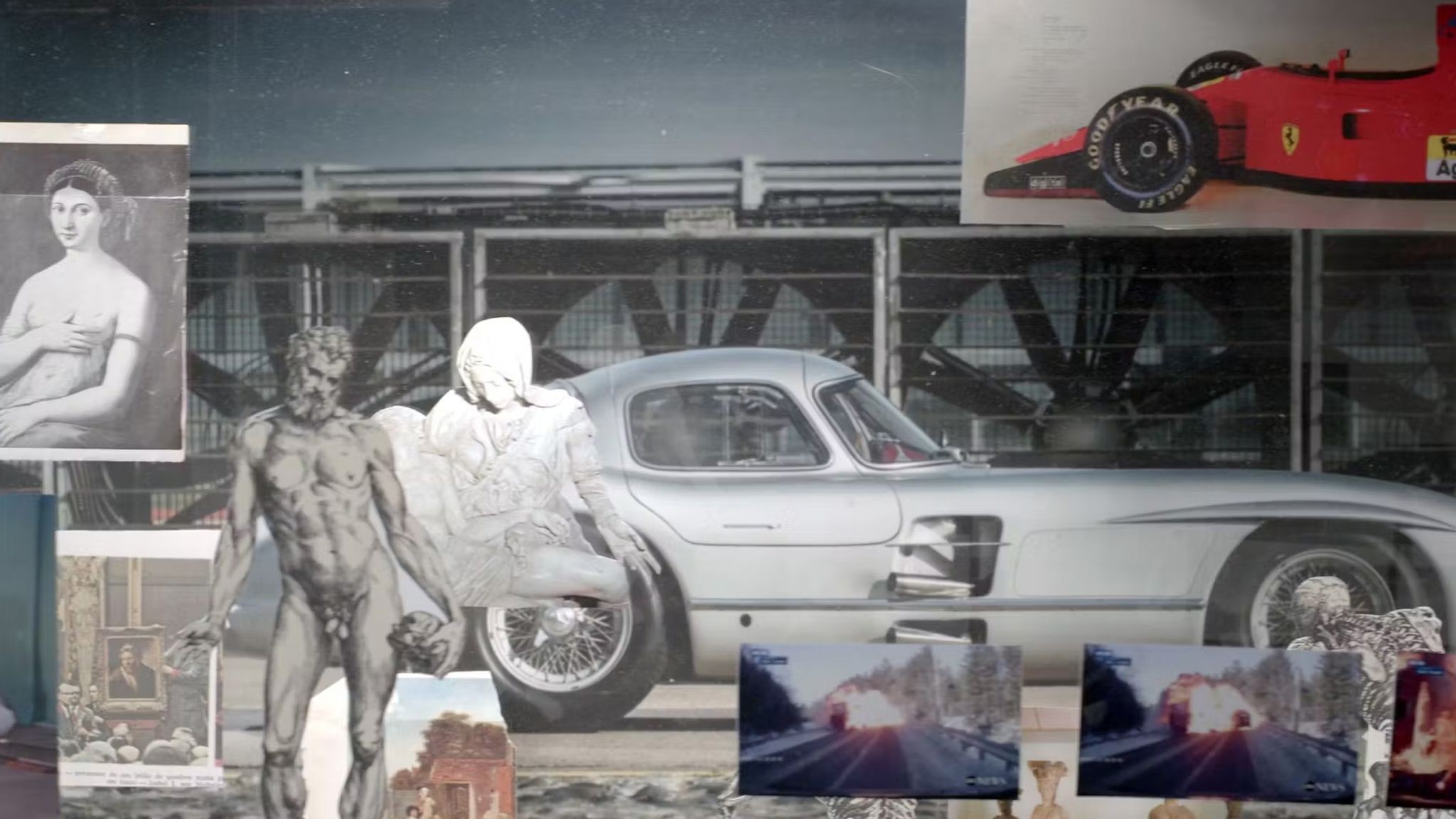 Sara Cwynar's Baby Blue Benzo explores the intersections of photography, artifice, and contemporary life through a collage-like assembly of archival and found materials. Using found images, AI-generated visuals, and new video footage, Cwynar weaves a dense narrative that reflects on how images shape perception and productivity in the modern era. Central to the work are recurring motifs like a replica of the 1955 Mercedes-Benz 300 SLR and the color baby blue, which connect luxury, consumerism, and personal struggles like insomnia.