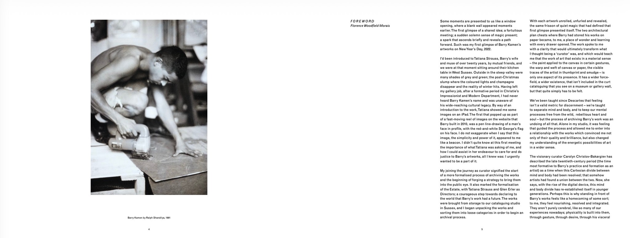 This publication features installation imagery from the exhibition, film stills, and photographs of exhibited artworks, alongside new collages by Tyrone Lebon and Frank Lebon, and introductory essays from the Barry Kamen Estate and art writer Matthew James Holman.