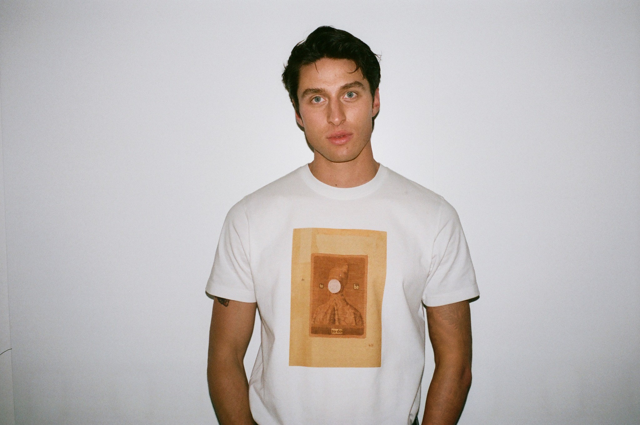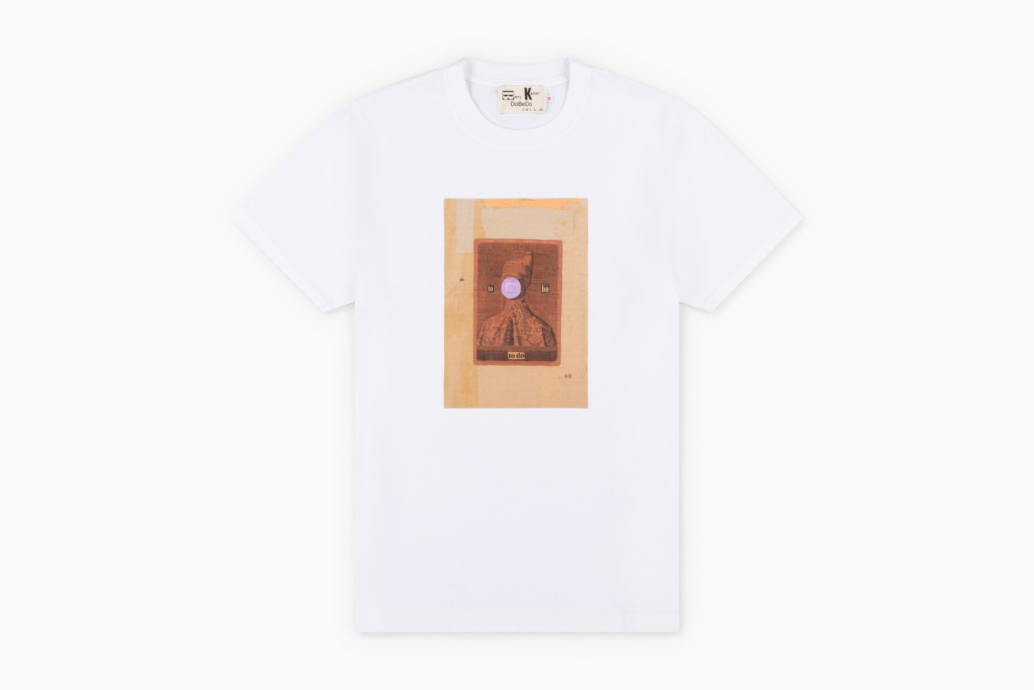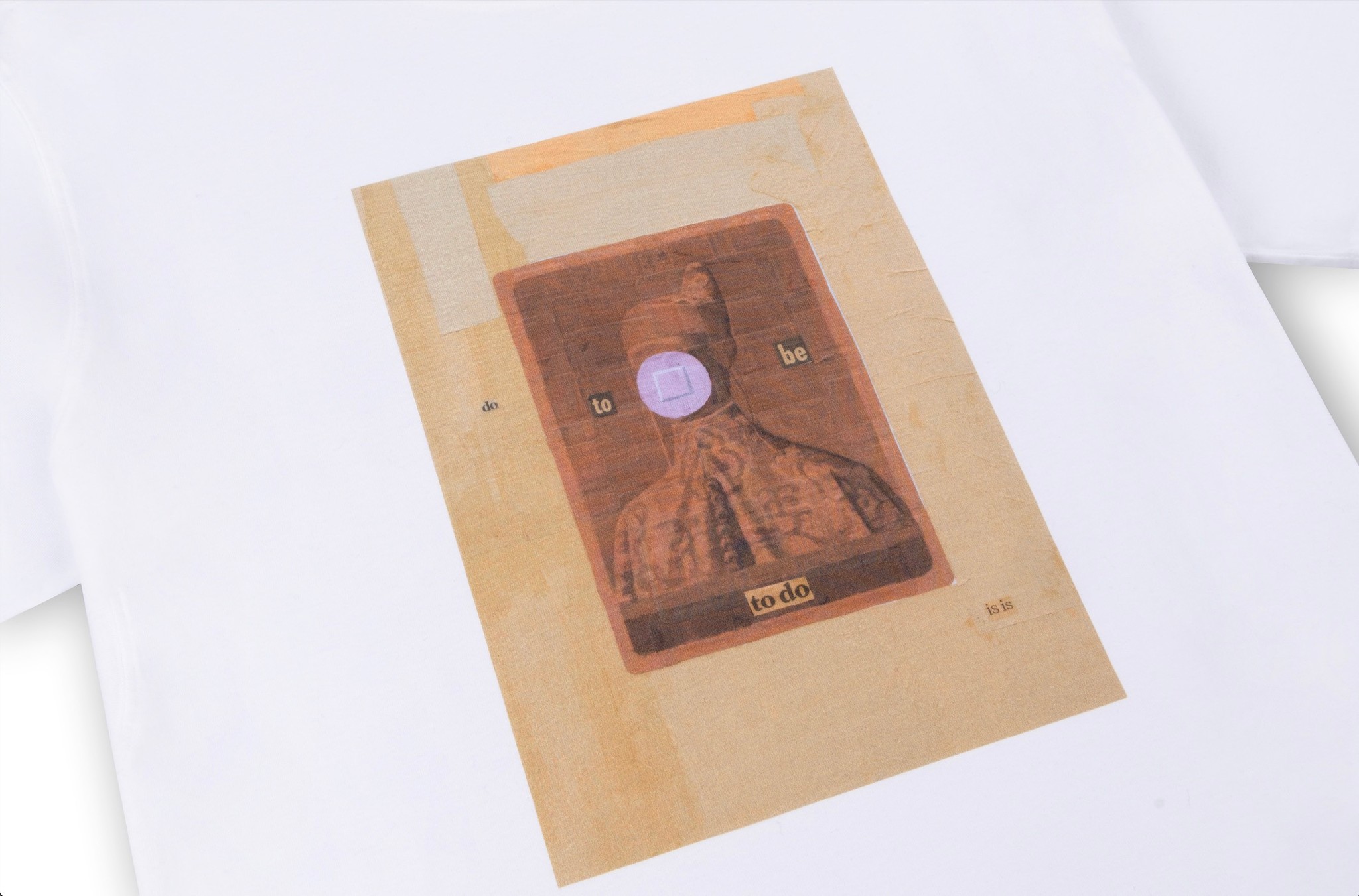 This T-shirt features the artwork To Be To Do, painted directly onto plasters. The composition includes an Old Masters portrait alongside newspaper clippings reading “DO” and “BE.”