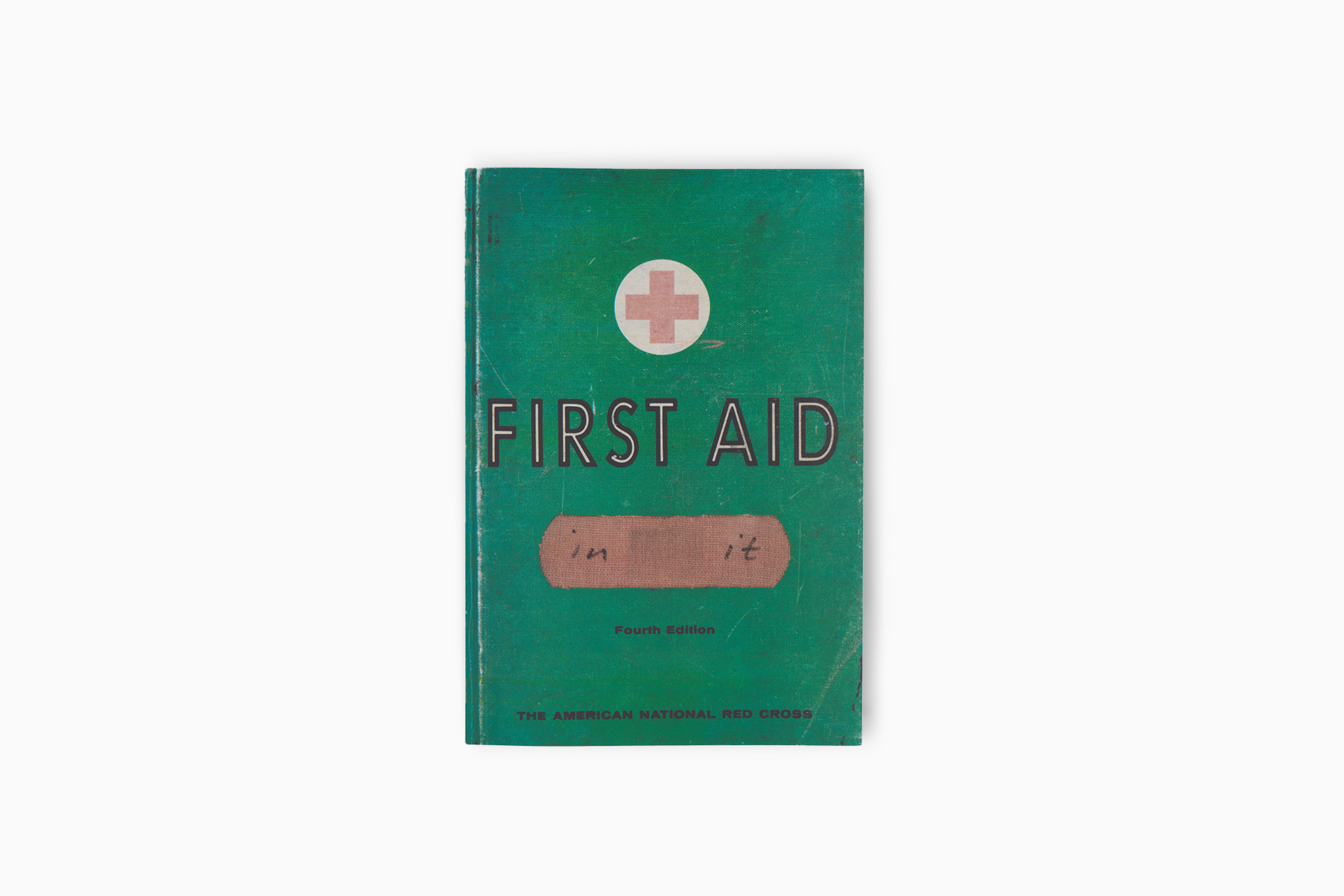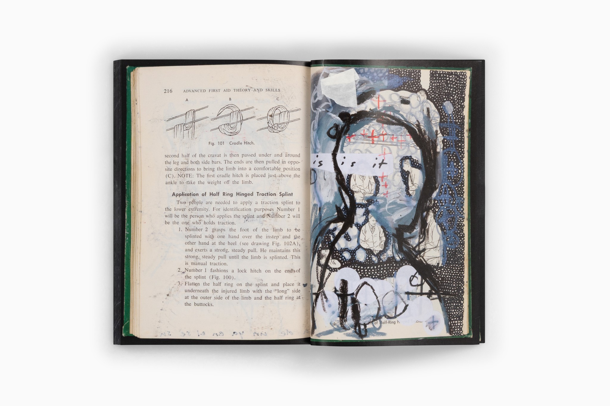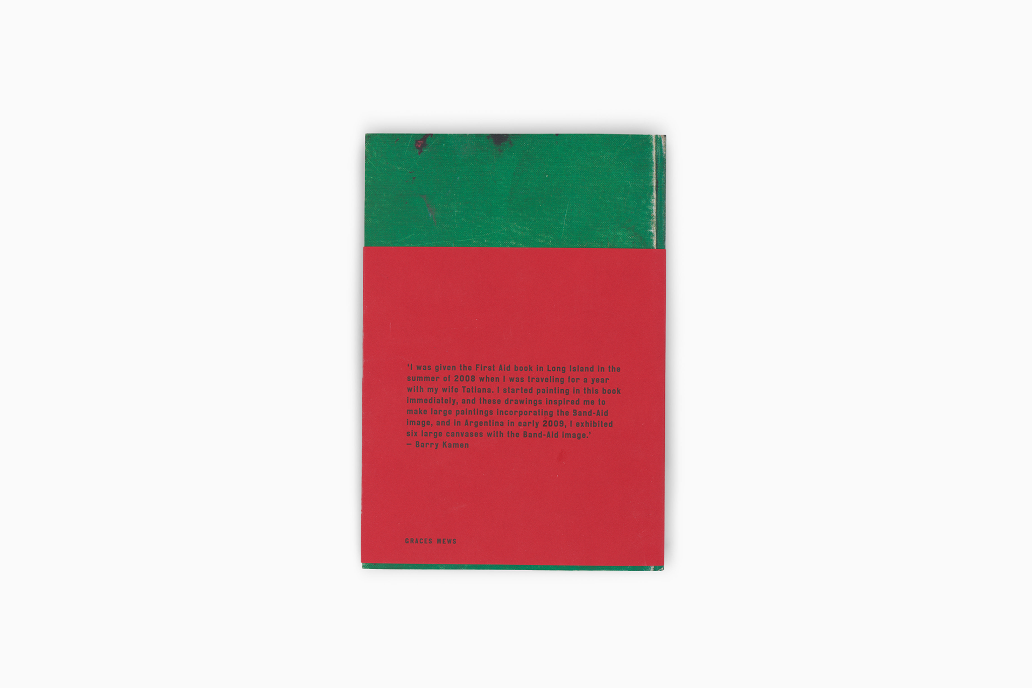 "I was given the First Aid book in Long Island in the summer of 2008 when I was travelling for a year with my wife Tatiana. I started painting in this book immediately, and these drawings inspired me to make large paintings incorporating the Band-Aid image, and in Argentina in early 2009, I exhibited six large canvases with the Band-Aid image" – Barry Kamen
