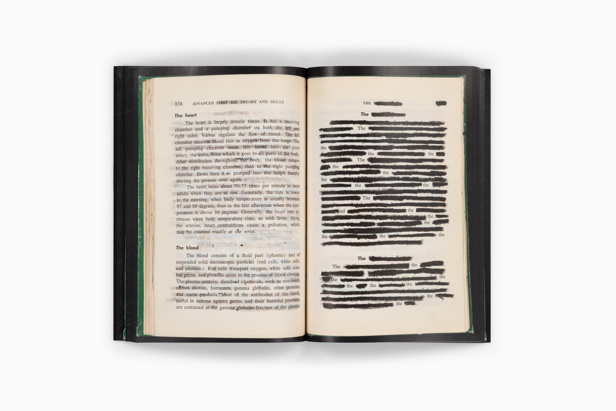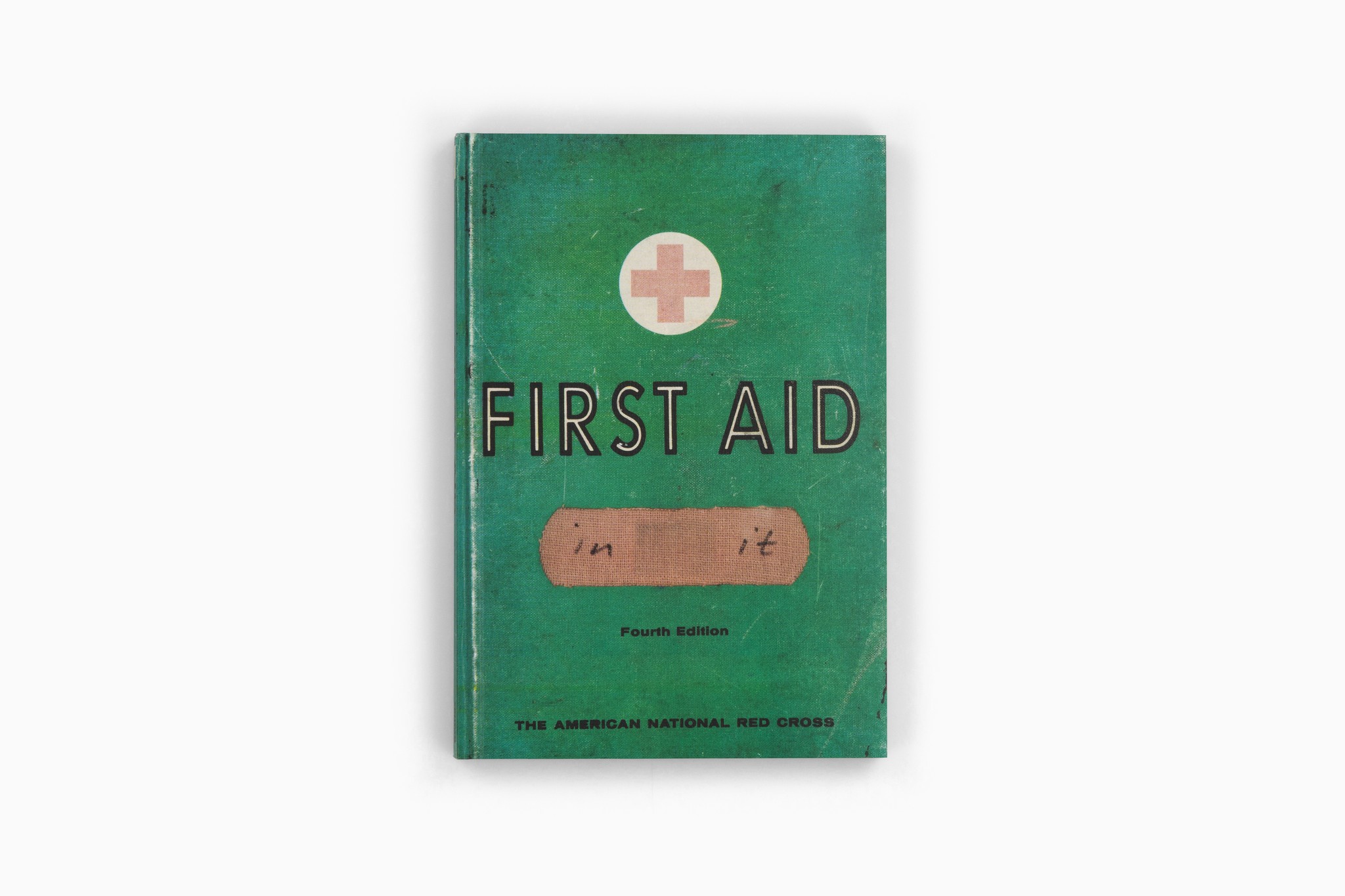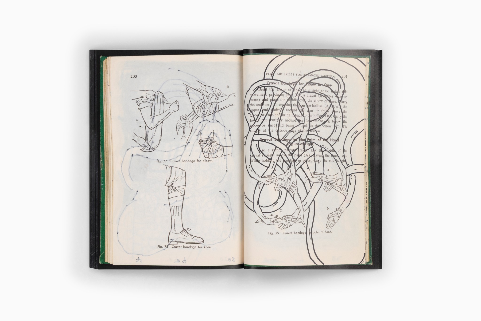 "I was given the First Aid book in Long Island in the summer of 2008 when I was travelling for a year with my wife Tatiana. I started painting in this book immediately, and these drawings inspired me to make large paintings incorporating the Band-Aid image, and in Argentina in early 2009, I exhibited six large canvases with the Band-Aid image" – Barry Kamen